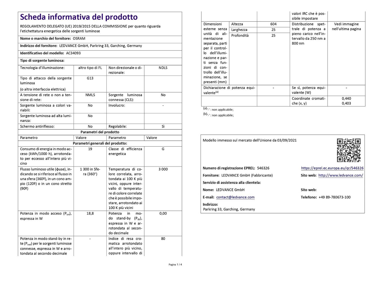 Neon T8 18W/830 luce bianco calda 3000K, marca Osram. Lunghezza totale 60 cm. Confezione 25 pezzi.